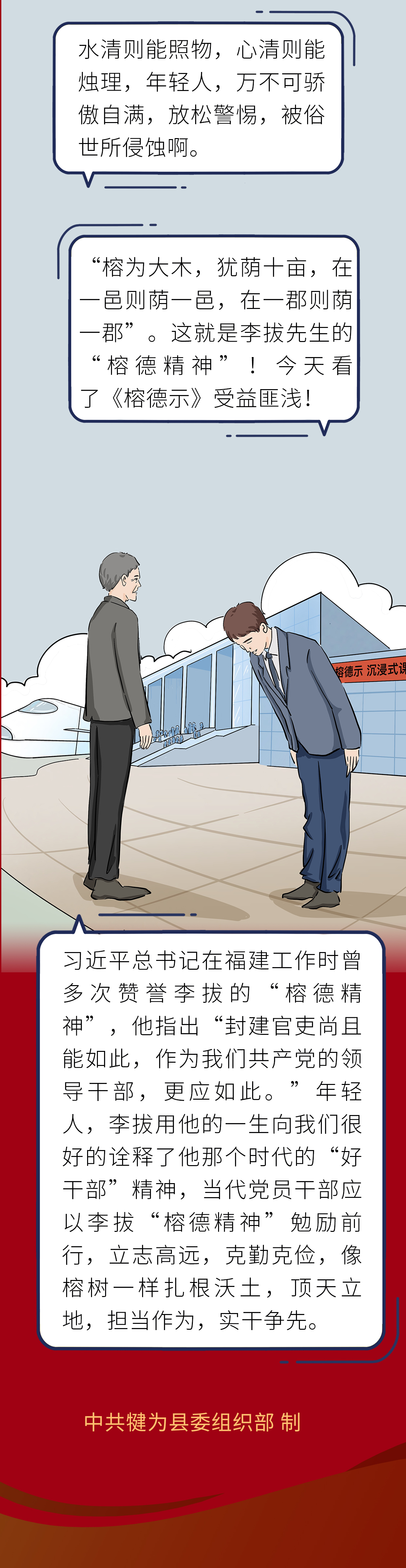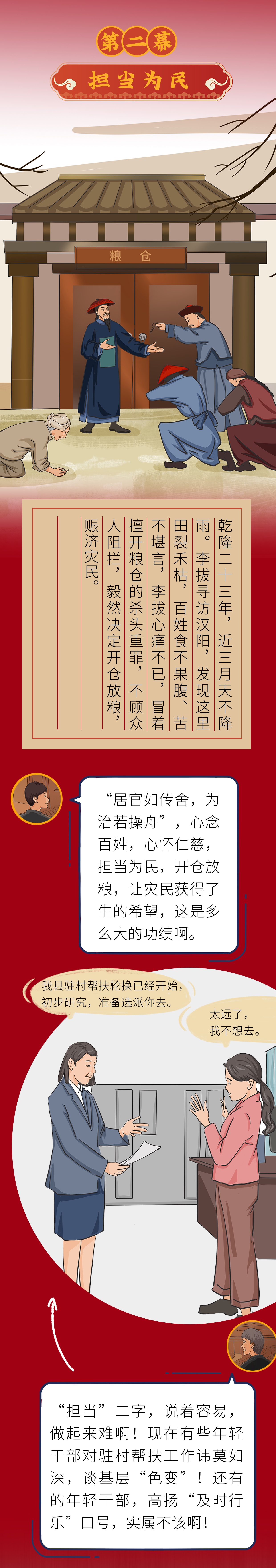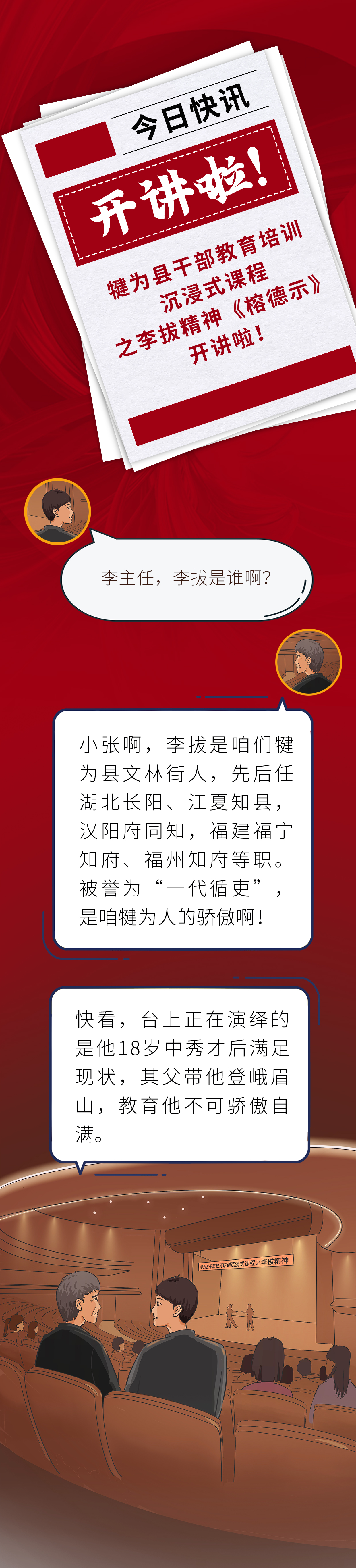 四川省犍为县近年来挖掘历史文化,坚持对本地教学资源进行升级、打造,依托县委党校主阵地,开发沉浸式课程《榕德示》,把“一代循吏”李拔精神搬上“舞台”,全景式呈现李拔“居官为治、勤政爱民”的“榕德精神,打破固有课堂教学模式,将舞台剧变为沉浸式课程,持续把县域特色资源转化起来,不断为干部教育培训提供优质供给,推动干部教育培训既“透”又“活”,入脑入心。