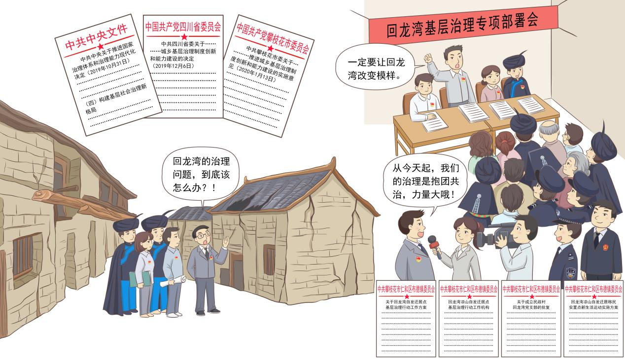 回龙湾位于四川省攀枝花市仁和区布德镇民政村,因发掘出距今约2万年的古人类化石、器物而享有盛名,现有3个村民小组,海拔高度1000米到1800米。从2002年以来,回龙湾先后接纳了邻近市州8个县自发迁居的彝族同胞共1228人259户,是全省最大的自发迁居点。由于特殊的历史原因和地理条件,回龙湾一度成为了全市突出的治安乱点和高山穷点,周边群众常常对此避而远之。2019年以来,在各级党组织领导下,广大党员率先带头积极参与回龙湾基层治理工作,取得了由“乱象”到“和谐”华丽蝶变的好成绩,其典型经验先后获得中央政法委、省委政法委的充分肯定,迎来了基层治理的春天。