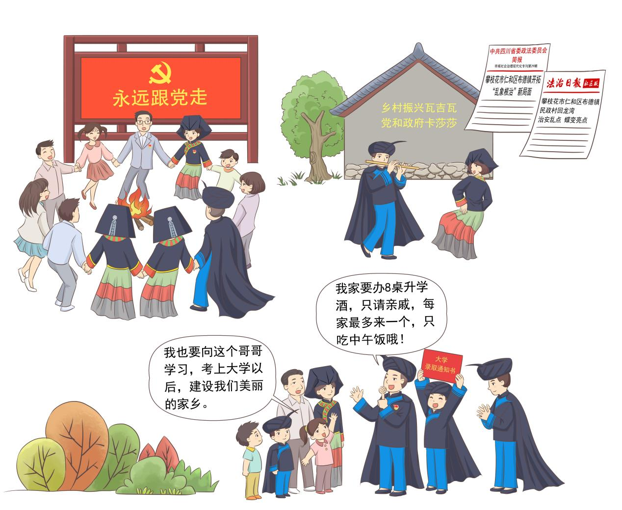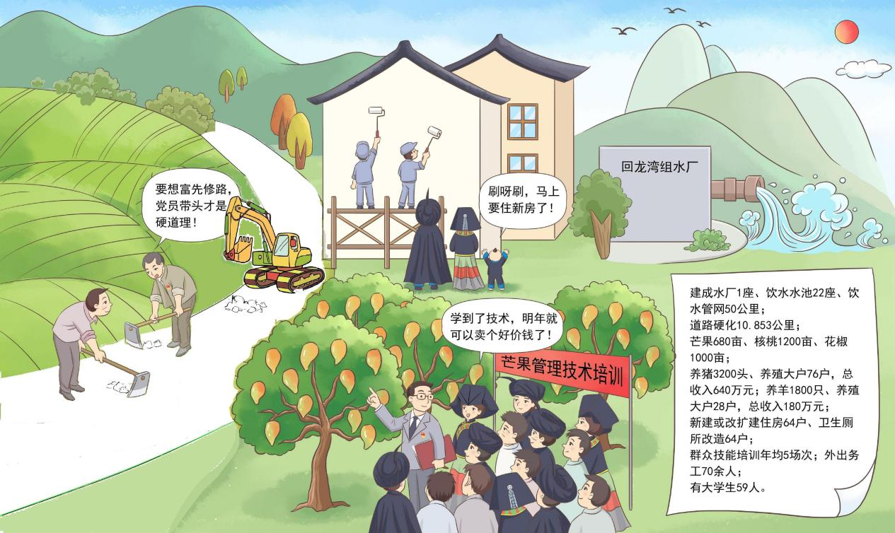 实施乡村振兴战略以来,回龙湾党支部紧紧围绕“产业兴旺、生态宜居、乡风文明、治理有效、生活富裕”的方针,大力发展特色产业,积极鼓励群众多学技能、多方致富,形成了以牛羊养殖和特色芒果、花椒种植等为主的主导产业;深入实施乡村建设行动,基础设施改善和人居环境实现大变样,住进“彝家新居”的彝族群众心情舒畅;聚焦移风易俗,深挖优秀的彝族文化,成立文艺队,举办火把节,开展彝族刺绣、彝族服装评比等特色民俗活动,群众物质生活和精神生活蒸蒸日上。