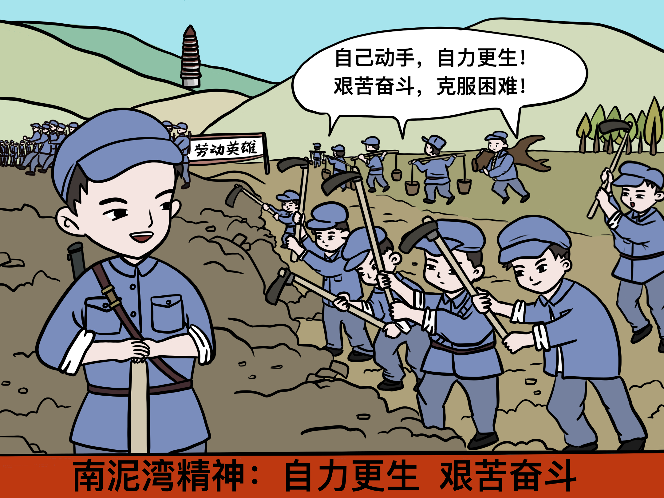 “背枪上战场,荷锄斗田庄”,艰苦创造,“自己动手”垦出“丰衣足食”。面对敌军的包围封锁,面临补给匮乏的困境,党中央发出“自己动手,自力更生,艰苦奋斗,克服困难”的号召。八路军359旅进驻南泥湾地区,一手拿枪,一手拿锄,一边练兵,一边屯田垦荒。在生活条件极为艰苦、经济十分困难的情况下,全旅战士积极发扬自力更生、艰苦奋斗的革命精神,从旅长王震到公勤人员,全员战斗在开荒第一线,学耕作、造工具,开荒地、种庄稼,同甘共苦、战胜困难,用双手和汗水把“狼豹黄羊满山窜,一片荒凉少人烟”的“烂泥湾”变成了“到处是庄稼,遍地是牛羊”的“陕北江南”。作为延安精神的重要组成部分,“自力更生、艰苦奋斗”的南泥湾精神激励着全党上下战胜困难,走向胜利。