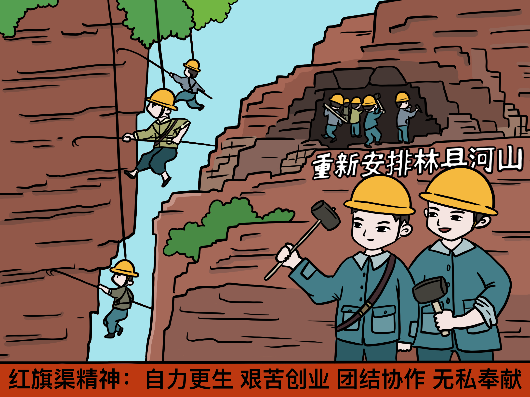 “天上无水蓄、地下无水汲”,艰苦创业,“十万大军”凿出“一渠清水”。“吃水如吃油,十年九不收。”因为缺水,林县91.8万亩耕地里只有1.2万亩水浇地,550个村里有307个村需要远道取水吃;因为缺水,有林县人因为打翻从山里挑回来的两桶水而上吊自杀。缺水,犹如一座大山压得林县人喘不过气。“林县人民多壮志,誓把河山重安排。”林县人民决定迎难而上劈开太行山修渠引水。没有钱,就出去赚!没有水泥,就烧石灰!没有火药原料,就用锯末、用煤面、用牛粪、用人粪。“有志者,事竟成;苦心人,天不负”。十万林县人民用十年时间削平太行山1250座山头,在悬崖峭壁间凿出“人工天河”——红旗渠。一渠绕群山,精神动天下。如今,红旗渠水依然在巍巍太行山中静静流淌,滋养着林县人民,而“自力更生、艰苦创业、团结协作、无私奉献”的红旗渠精神就像一座丰碑、一面旗帜,激励着中华民族在逐梦路上奋勇前行。