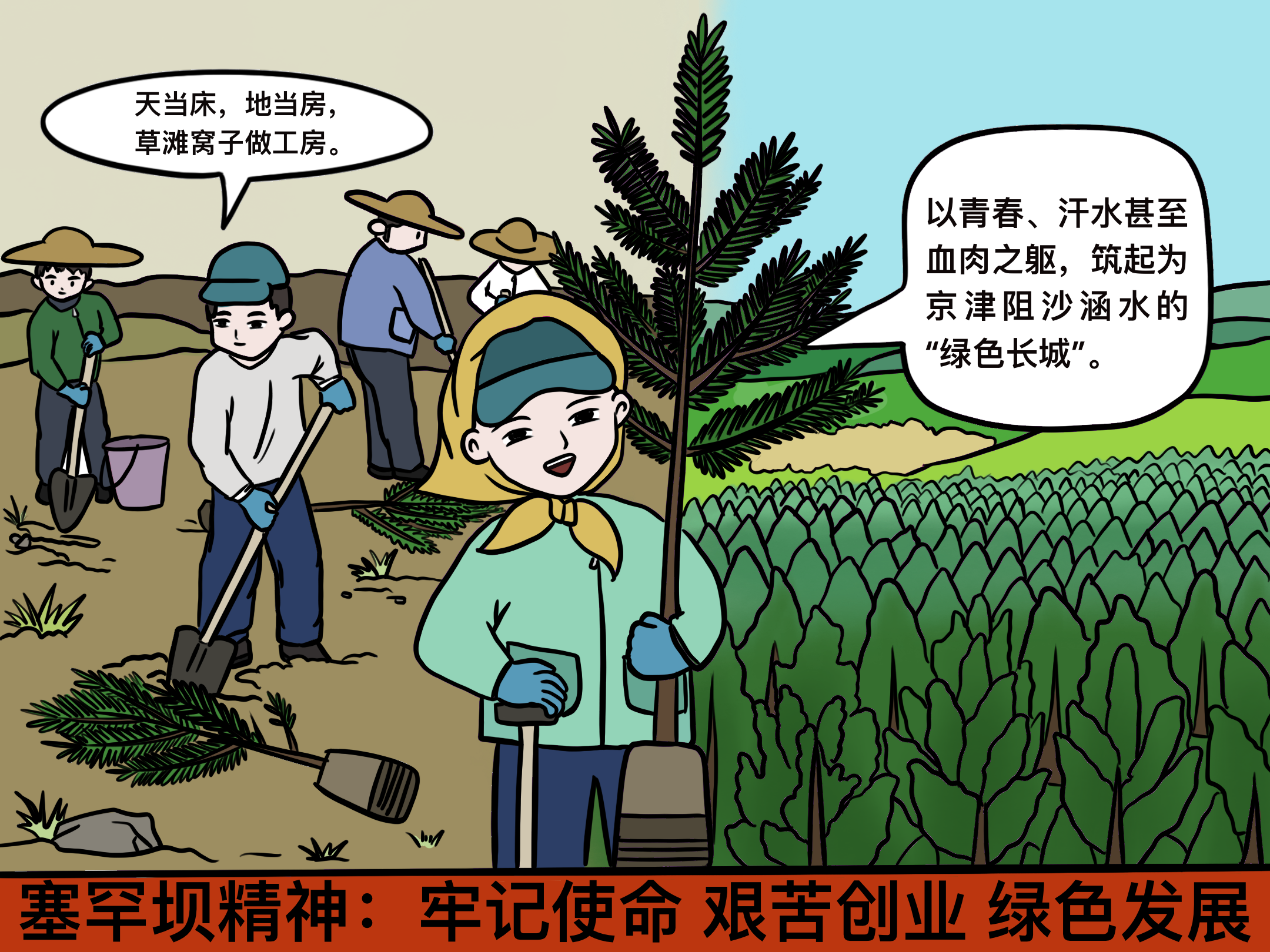 “黄沙遮天日,飞鸟无栖树”,艰苦创新,“三代接力”种出“绿色奇迹”。林地面积115.1万亩、世界面积最大的人工林,树木排起来可绕地球12圈,森林覆盖率82%,每年涵养水源、净化淡水2.84亿立方米……这些“硬核”数据背后,是属于塞罕坝人的一部高寒沙地造林的科技创新史。“不绿塞罕坝,誓死不后退”。塞罕坝人不畏艰难,愈挫愈勇,克服了一个个困难,闯过了一道道难关:改进“水土不服”的苏联造林机械和植苗锹,改变传统的遮阴育苗法,在高原地区首次成功实现全光育苗;创造“三锹半缝隙植苗法”,比传统方法造林功效提高一倍以上;用雪藏种子育苗法让樟子松在塞罕坝落地生根,创新沙棘带状密植、柳条筐客土造林等新方法,解决沙地、石质阳坡造林难问题;采取大穴整地、客土、覆膜等措施,让9万多亩石质荒山全部实现造林绿化。60多年来,以赵振宇、刘海莹、于士涛为代表的三代塞罕坝人,接续奋斗、久久为功,将百万亩荒原改造成林海,以红色精神创造了绿色奇迹。“牢记使命、艰苦创业、绿色发展”的塞罕坝精神也激励着中国人民为建设美丽中国而不懈奋斗。